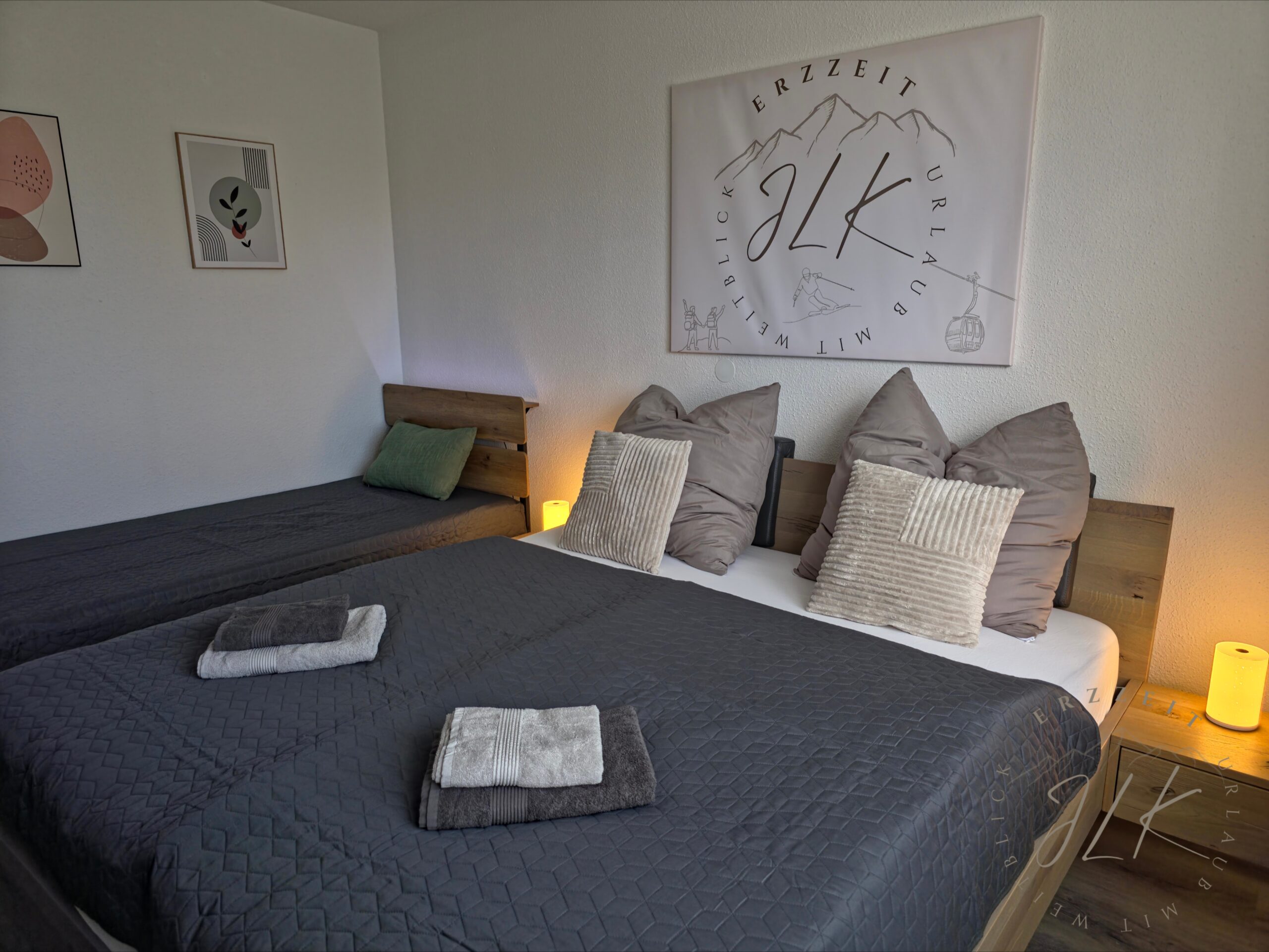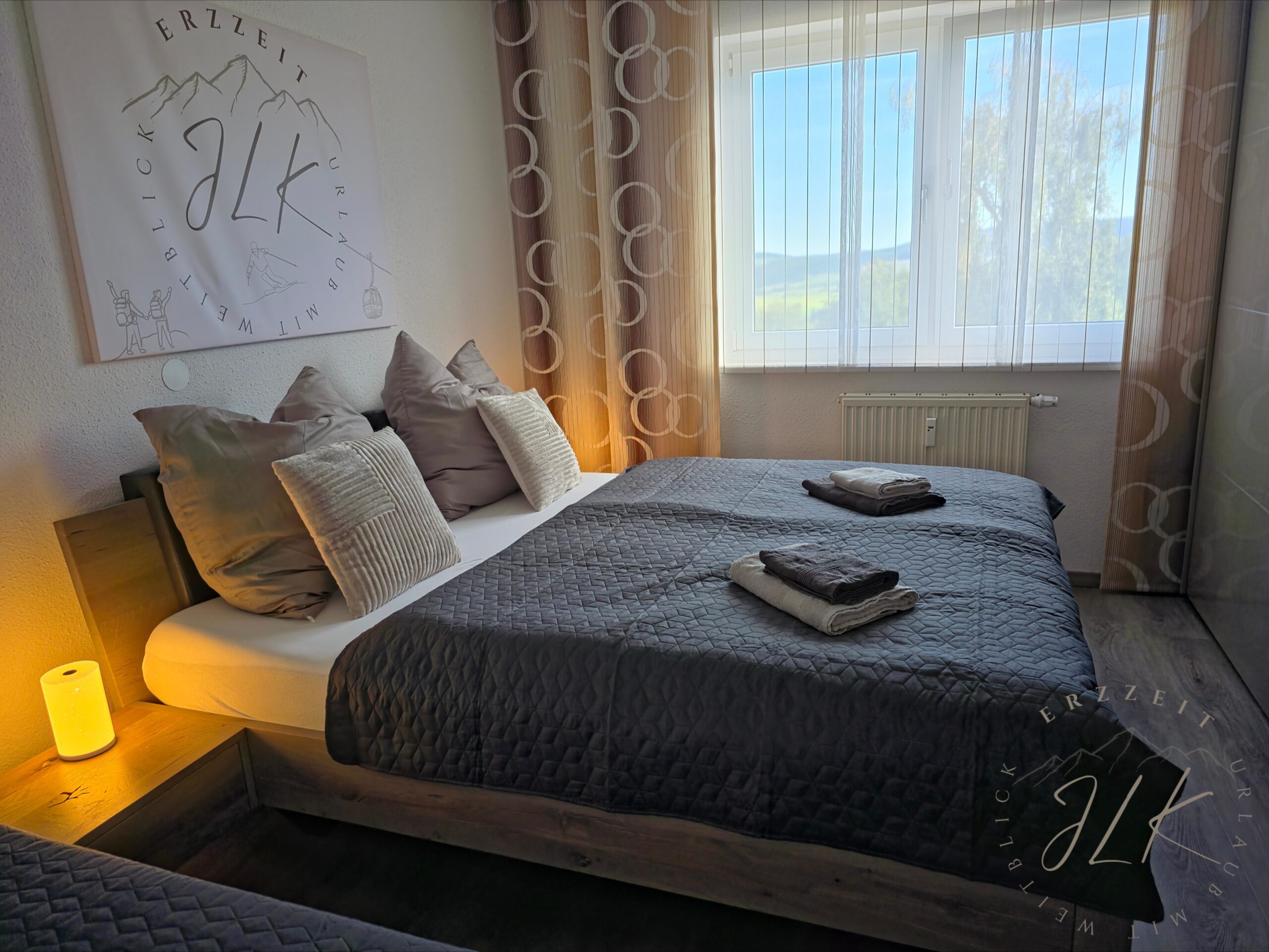 Unsere Ferienwohnung liegt hoch über Schwarzenberg und bietet Platz für bis zu 4 Personen. Sie verbindet stilvolles Wohnen mit Komfort und ist ideal für Paare, kleine Familien oder Alleinreisende, die Ruhe und Natur genießen möchten. Das Apartment ist modern ausgestattet und bietet alles, was man für einen entspannten Aufenthalt benötigt: ein gemütliches Schlafzimmer mit Doppel- und Einzelbett, ein helles Wohnzimmer mit ausziehbarem Boxspringsofa, eine voll ausgestattete Küche sowie ein modernes Bad mit Tageslicht. Alle Räume lassen sich bei Bedarf mit Rollos komplett verdunkeln. Zur Wohnung gehört ein eigener Tiefgaragenstellplatz, von dem man bequem mit dem Aufzug ins Hochparterre gelangt. Auch Fahrräder oder Skiausrüstung können sicher im abschließbaren Kellerraum untergebracht werden.